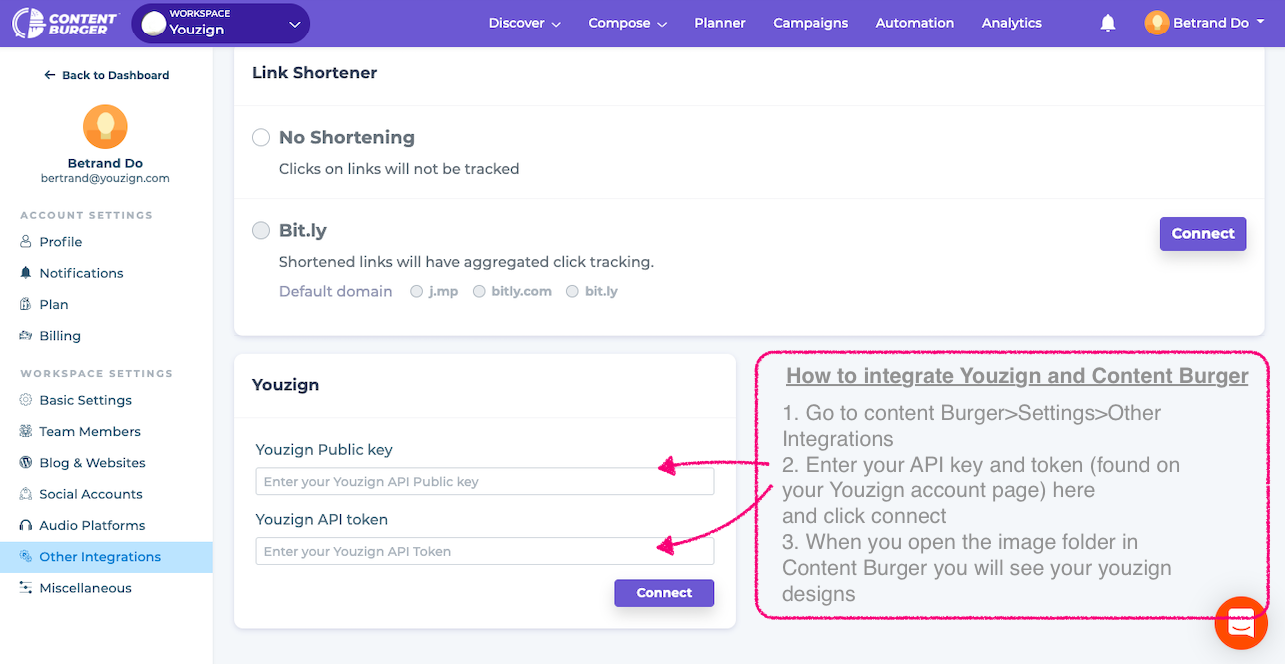 3. Go to Other Integrations tab and key in your Youzign public API and Token and click Connect.