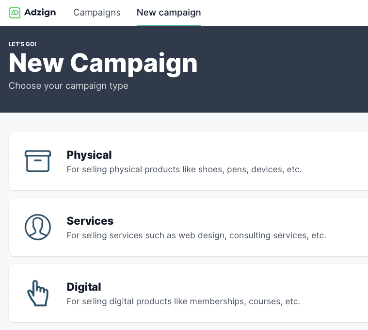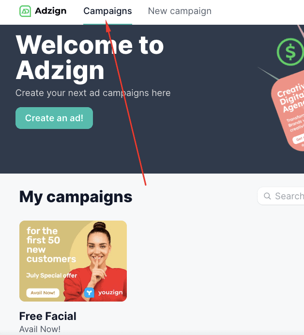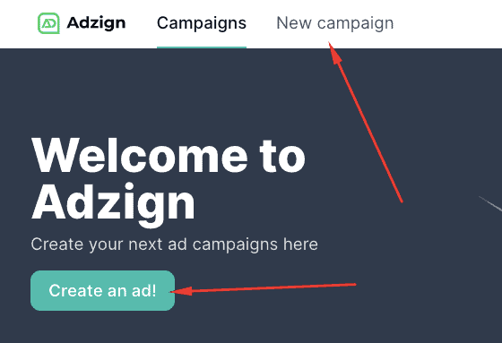 1. Login to your Adzign dashboard and choose Create an Ad or simply click the New Campaign tab