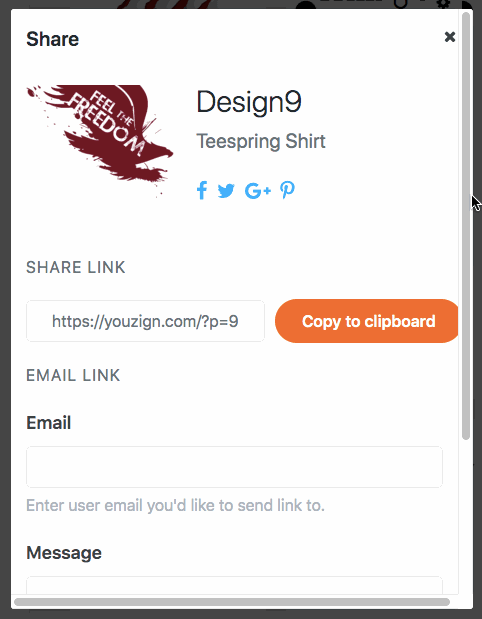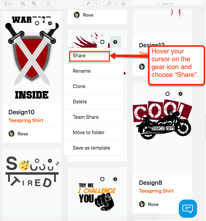 Simply hover your cursor on the gear icon on top of each design and select "Share".