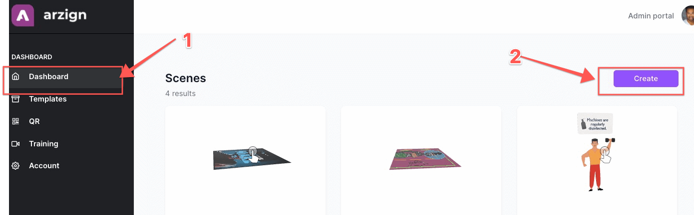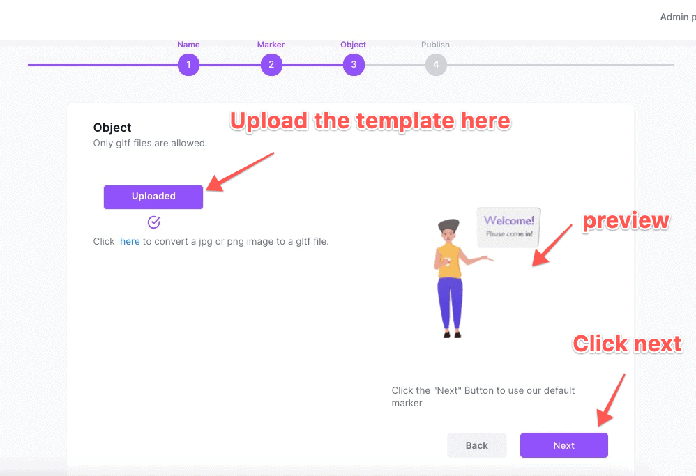 3. Simply add a name for your scene on Step 1, and choose a Marker on Step 2. In Step 3, this is where you can upload one of the templates which is in GLTF file.
