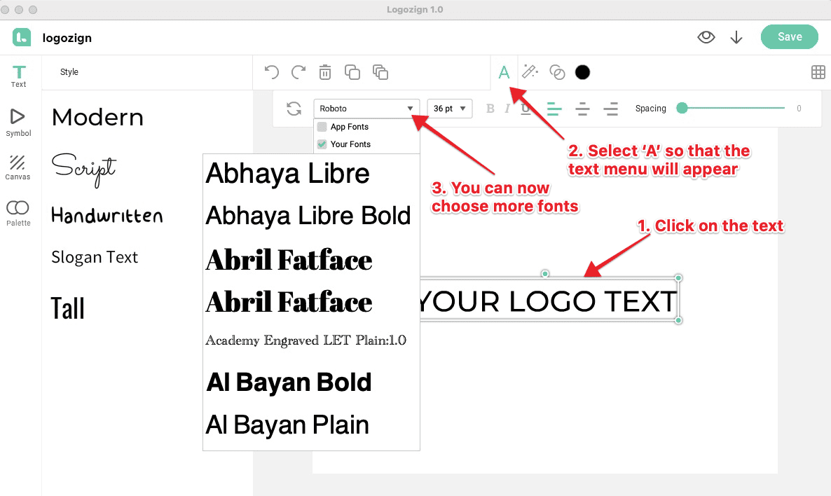 2. Select the text and click on the 'A' icon on the top menu. This will show the text options.