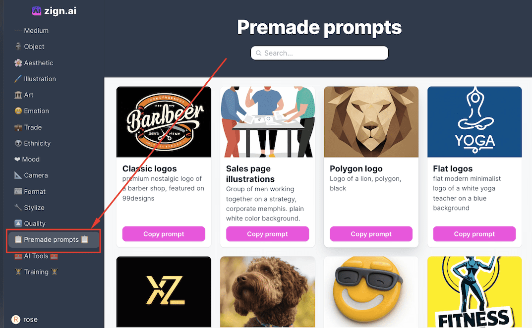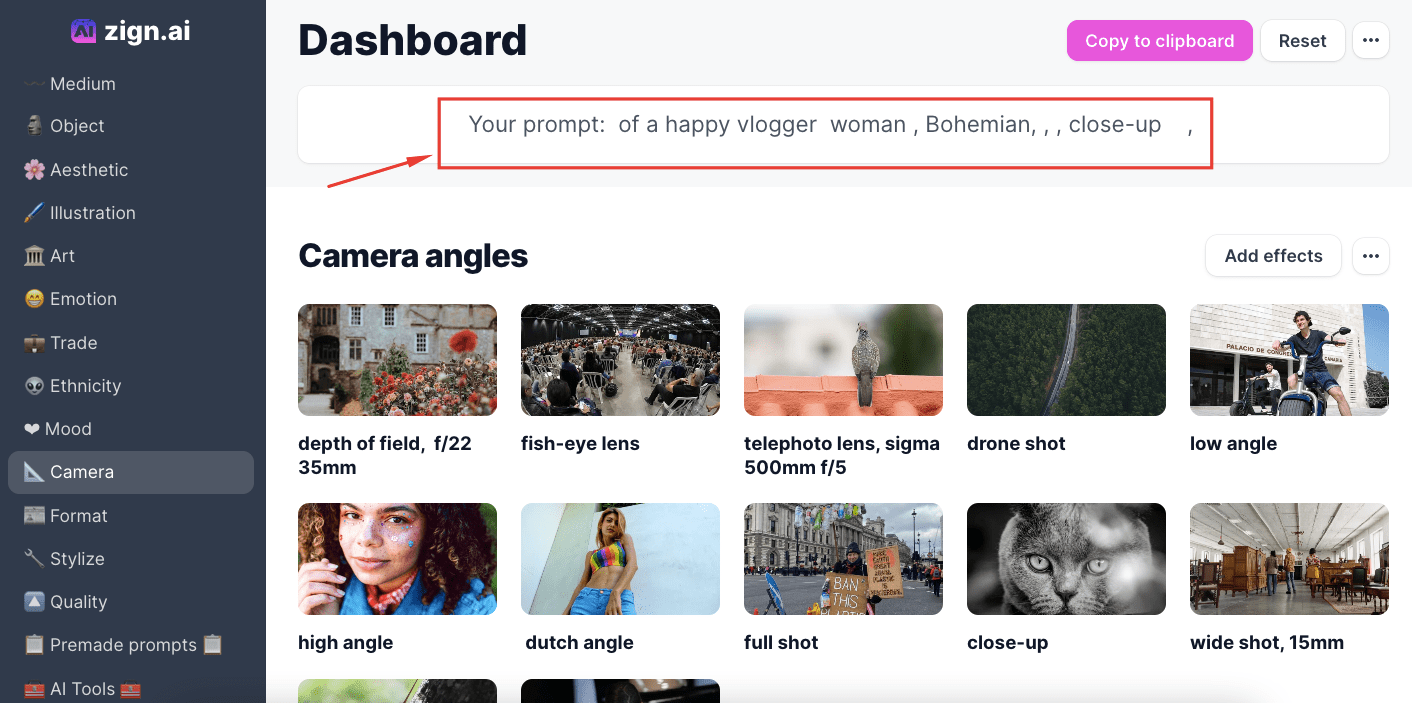 Zign.ai helps you come up with the right keywords or "AI prompts" like descriptions, medium, emotion, effect, design styles, poses, background options, image ratio, and so much more to generate the image you have in mind as closely as possible.
