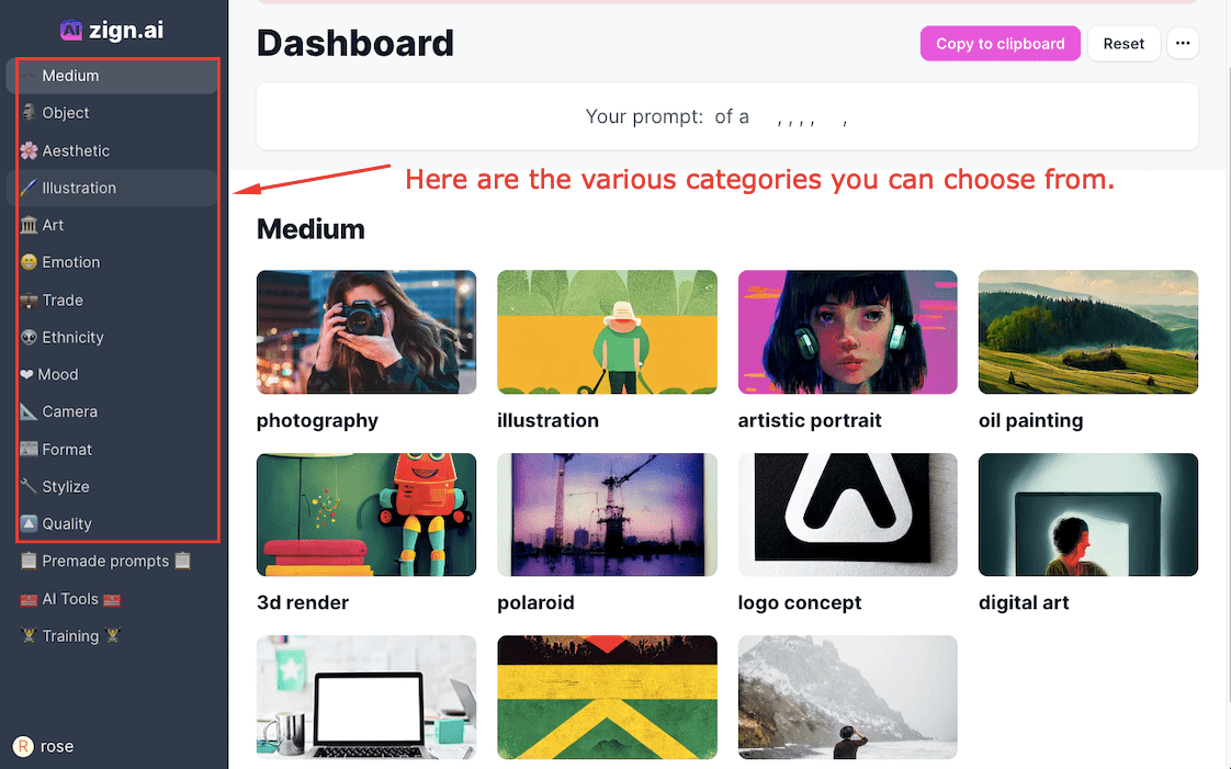 3. Inside a category, you can find different attributes that you can use to describe the image you have in mind. Select any attribute to add them to the prompt field on top of your dashboard.