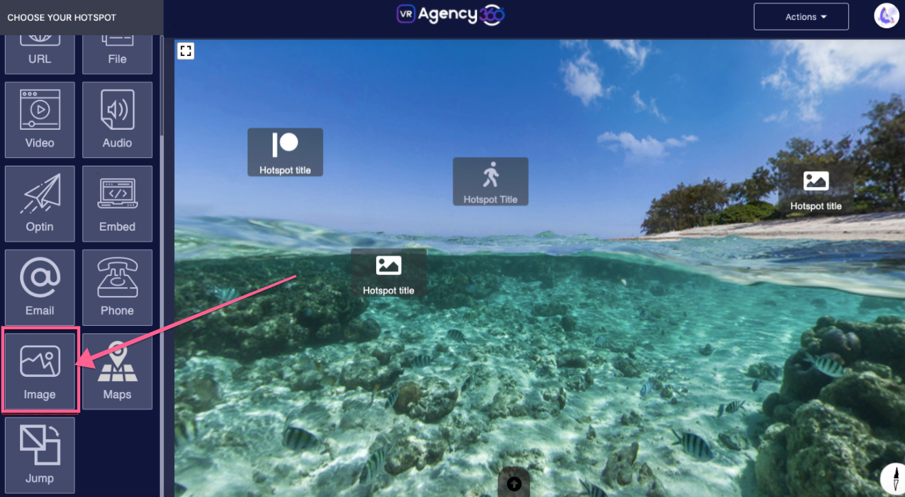 3. After successfully connecting your accounts, you can now fetch your Youzign designs inside the VR Agency editor. Simply click on the "Add an Image" module to the 360 image.
