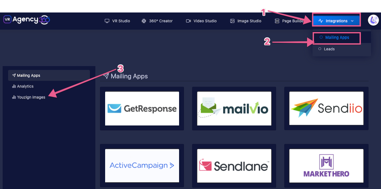 2. Connect your Youzign account by selecting "Mailing Apps" from the submenu then "Youzign Images". Click here to get your API Public Key and token.